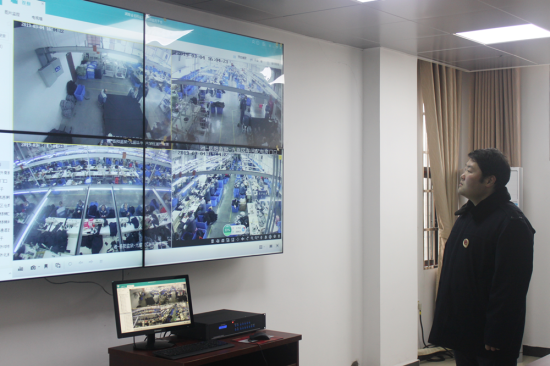 穿过初春的寒雾,我们到达了驻岳阳监狱检察室。驻狱检察官们换上检察制服,整了整衣容,准备进入监区开始一天的工作。陈君先走进监控室,对小编说:“看这满墙的监控显示屏,就是我们检察室的“天眼”,监区内全覆盖无死角。”忽然陈君盯着监控视频上的一个区域,大声喊其他同事:“快,我们去看看监区内这么多人聚集是什么情况。”大家立即赶往监区,见小编满眼疑惑,陈君边走边解释:“刚从监控视频里看到九监区车间门前很多干警和服刑人员聚集,肯定是有什么情况,我们必须及时了解并做出应对处置。”