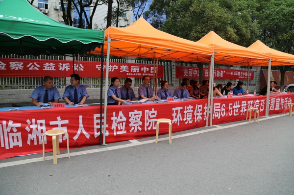 在市政广场,一字排开的宣传桌上摆满了检察机关公益诉讼宣传手册、公民生态环境行为规范倡议书;“开展公益诉讼、守护美丽中国”“美丽中国,我是行动者”等宣传横幅醒目悬挂,六块大型宣传展板整齐列开,停在一旁的广告宣传车循环播放省检察院统一制作的公益诉讼宣传片;上午八点半,该院的法律咨询台和市环保局的信访受理台前就挤满了市民群众,面对各类问题,检察官们一一作答,同时,结合民事行政检察职能向市民朋友讲解检察机关公益讼诉相关内容。
