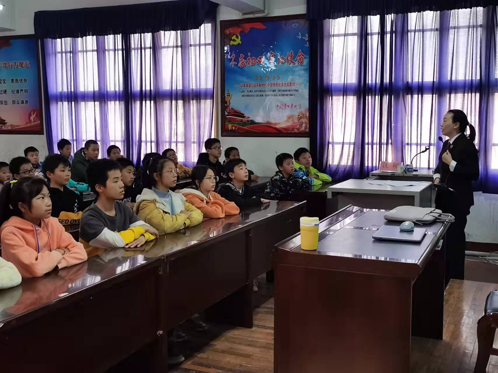 检察官朱莹以案释法,为现场师生讲述防诈骗、防欺凌等技巧,宣传禁毒相关知识,引导学生主动学习法律知识,学会用法律武器维护自身合法权益。