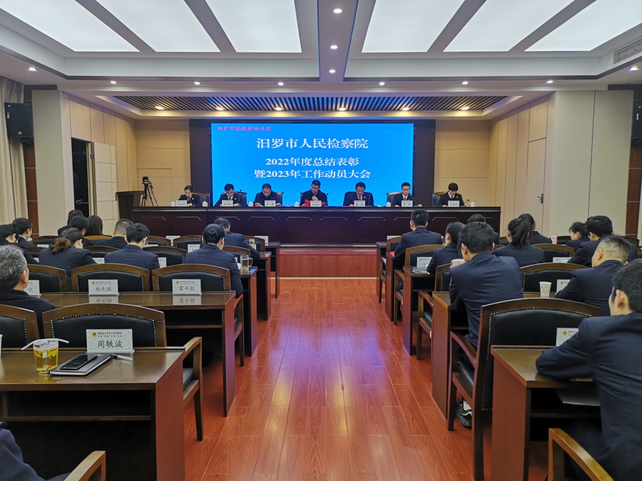 年工作成绩,对2023年工作提出了五点要求和希望:一是要持续在坚持政治方向上下功夫,毫不动摇地坚持党对检察工作的绝对领导,持续贯彻落实党的二十大精神,全面贯彻习近平法治思想,深入学习领会中央、省委政法工作会议精神,积极争取党委、党委政法委对检察工作的重视和支持;二是要持续在服务大局上下功夫,进一步牢固树立服务大局的意识,持续优化法治化营商环境,不断满足乡村振兴战略实施的法治需求,主动服务保障生态汨罗发展;三是要持续在履行职责上下功夫,不断完善监督体系,进一步改进监督方式,持续提升监督能力,不断增强检察监督的精准性和实效性,持续推进检察履职高质量发展;四是要持续在巩固提升司法体制改革成效上下功夫,进一步坚定改革方向、增强改革信心、保持改革韧劲,不断巩固提升司法责任制度改革成效,把司法体制改革引向深入,推动新时代检察工作不断创新发展;五是要持续在队伍建设上下功夫,坚持过硬标准,常抓不懈管党治检工作,把班子建设作为重要任务,把专业化建设摆在突出位置,持续在队伍建设上下功夫,巩固深化政法队伍教育整顿成果,持续整治顽瘴痼疾,推进全面从严管党治检向纵深发展,真正把检察队伍建设成为忠诚干净担当,让党放心、让人民满意的政法队伍。