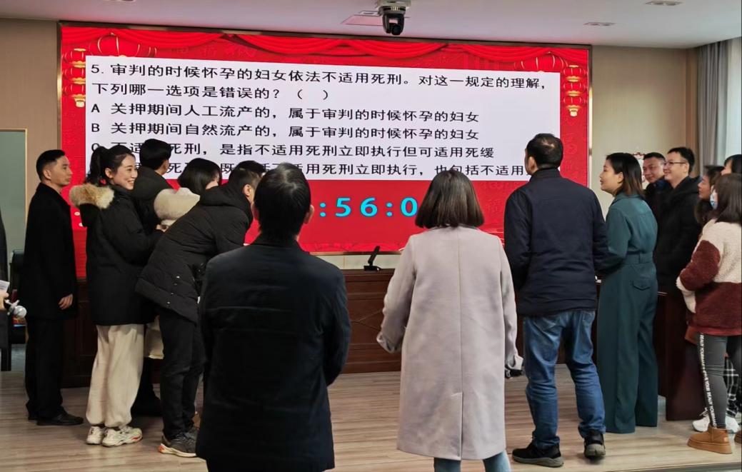 “叮叮叮……”,一阵阵急促的铃铛声响起,原来是院领导们正带领着各自的组员在进行法律知识竞答,台上答题的、台下观看的,都纷纷紧盯着大屏幕,因为画面滚动之时,便是抢铃之刻,所以这不仅考验大家的法律知识储备量,还考验大家的灵活度,各队都派出速度最快的来争夺每一个宝贵的答题机会。答题过程中,会场气氛高涨,台下干警也纷纷参与到题目讨论当中。