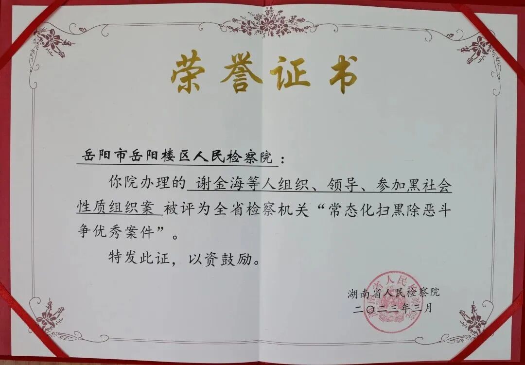 近日,湖南省人民检察院发布《关于表扬全省检察机关2022年度刑事检察优秀案件的通报》,岳阳楼区人民检察院办理的“谢金海等人组织、领导、参加黑社会性质组织案”被评为全省检察机关“常态化扫黑除恶斗争优秀案件”。